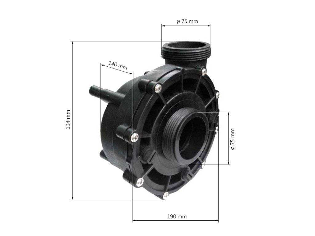 Der Durchmesser des Einlass- und Auslassanschlusses beträgt 75 mm Außengewinde zum Anschluss des Flansches (nicht im Lieferumfang enthalten)