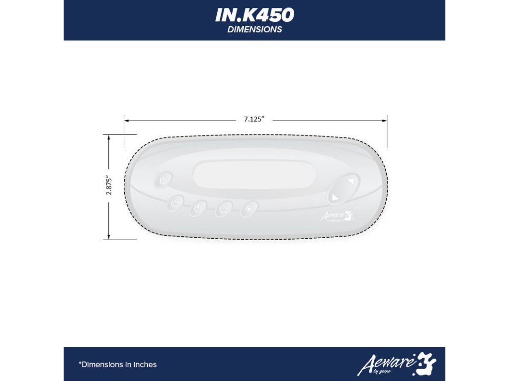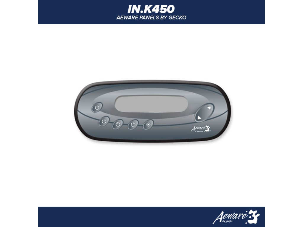 Control panel IN.K450 from Aeware by Gecko which is equipped with six buttons and has this button layout: Power, Jets 1, Jets 2, Jets 3, Light, Up, Down.