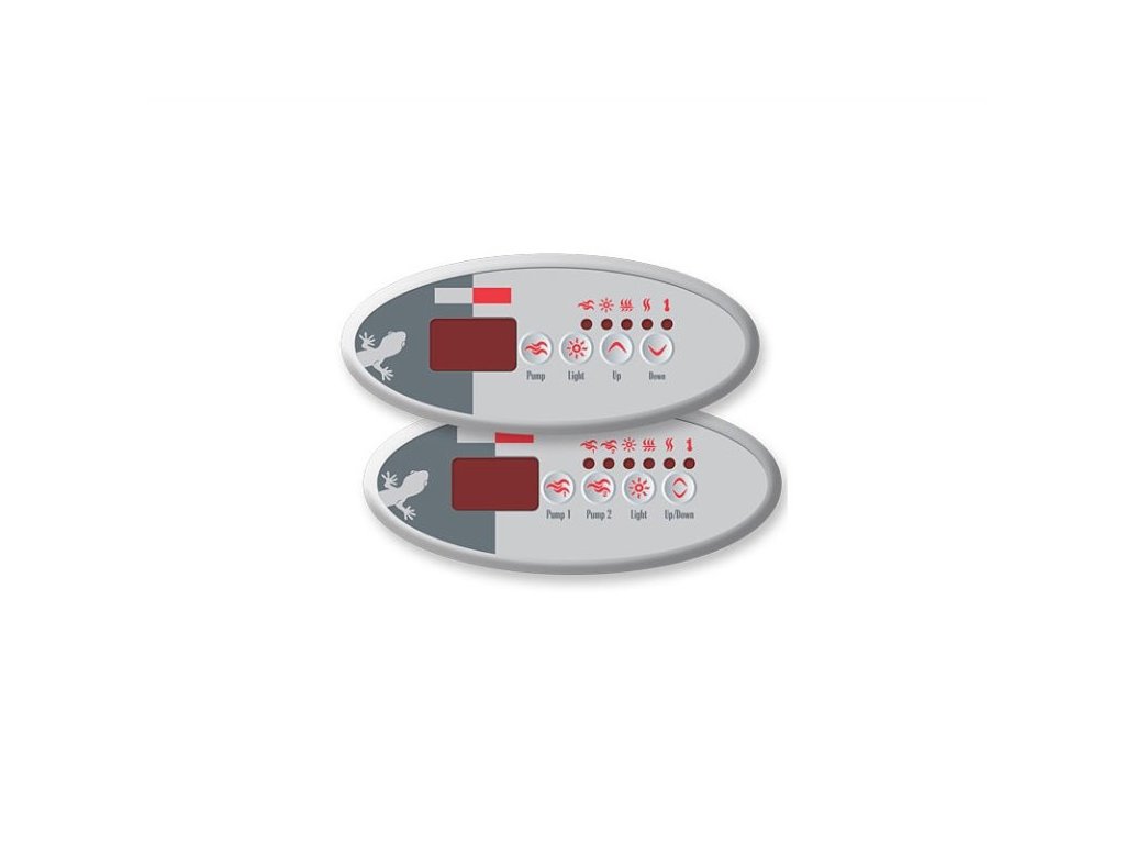 Control panel TSC-9, or also K-9 by the brand GECKO which offers four buttons is delivered with two overlaps Their layout is either Pump, Light, Up, Down or Pump 1, Pump 2, Light, Up/Down.
