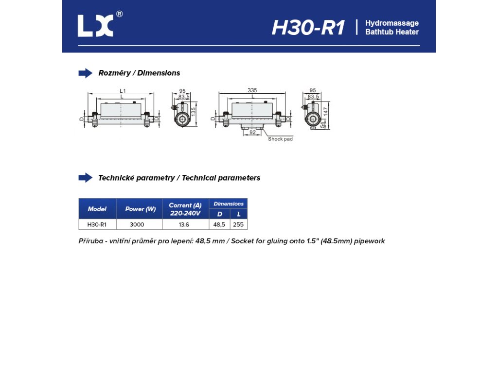 LX Heating for whirlpools H30-R1, 3kW - connection 48,5 mm
