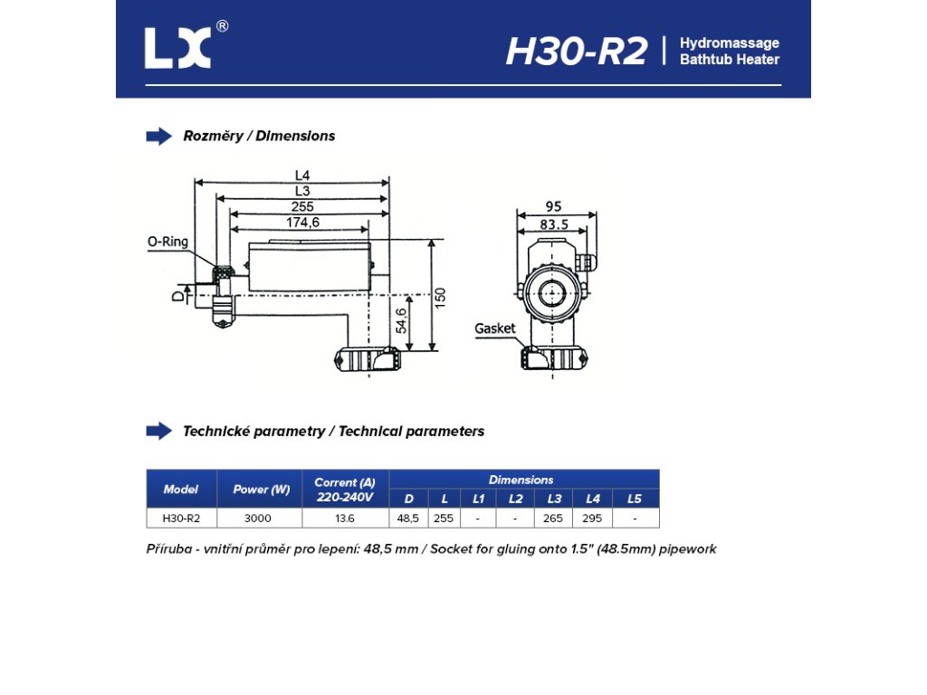 LX heating for whirlpools H30-R2, 3kW - connection 48,5 mm (L-Shape)