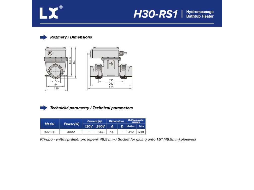 LX heating for whirlpools with thermoregulation H30-RS1, 3kW - connection 48 mm