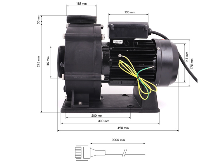 Výkonné cirkulační čerpadlo LX WTB220 pro vířivky, swim spa a bazény. Příkon cca 2.2 kW, průtok až ~1100 l/min a výtlak do ~11 m. Napájení 220 V / 50 Hz, připojení 3". Vhodné pro filtrační a cirkulační okruhy s čistou vodou do ~50 °C.