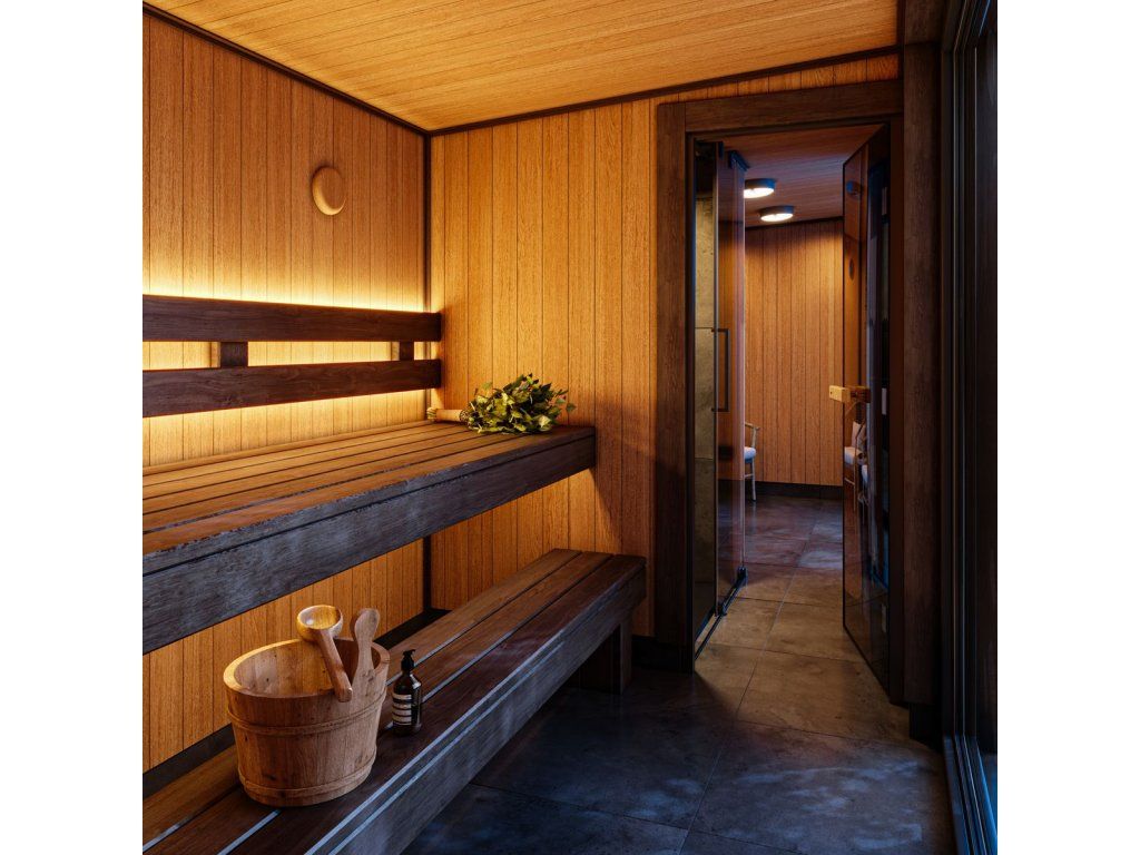 Luxusní modulární sauna APEX Lounge (6 m) představuje vrchol domácího wellness. Tento velkorysý model kombinuje prostornou parní místnost, komfortní sprchovou zónu a samostatnou odpočívárnu s vyhřívanou podlahou