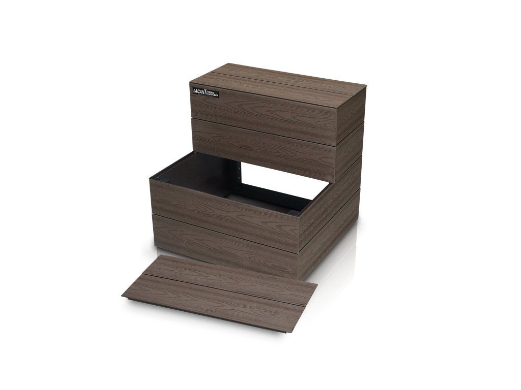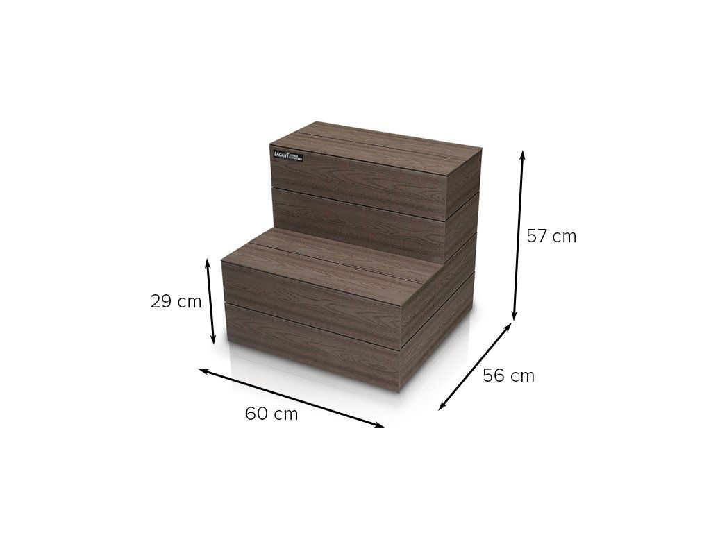 Materiál Lacan je vyroben z vysoce odolného materiálu PWC, který je určen do venkovního prostředí a je zcela rezistentní proti plísním a klimatickým podmínkám. Součástí každého schodiště je vyndavací prvek, pod kterým je umístěn úložný prostor například pro chemii, či příslušenství ke SPA.