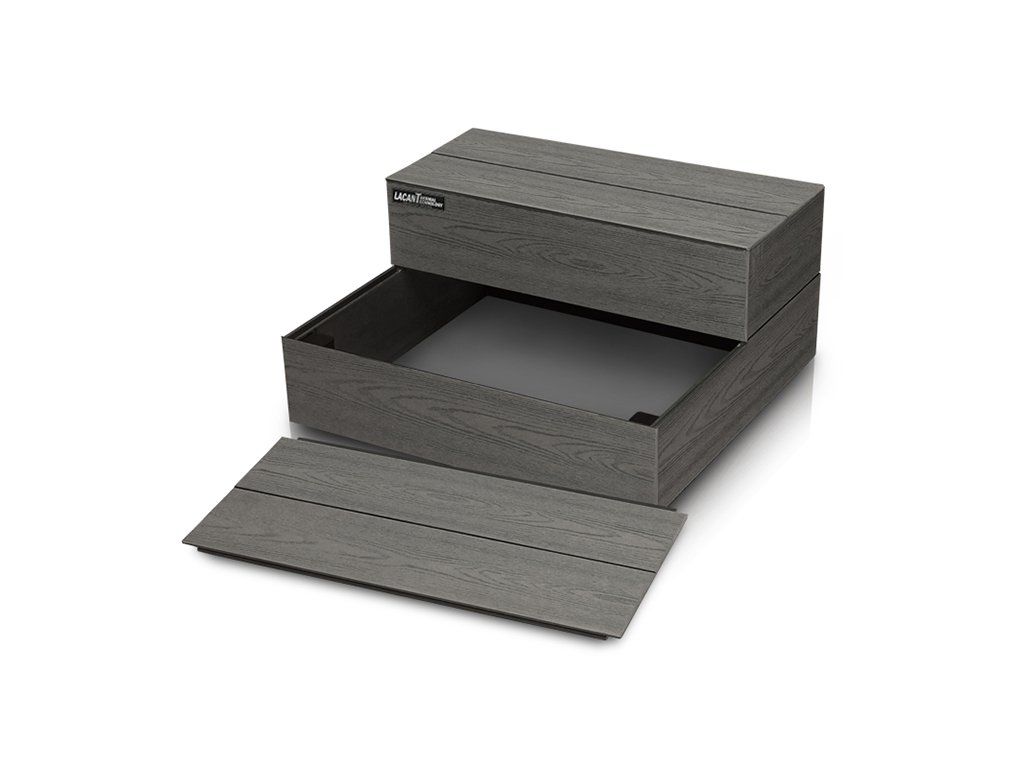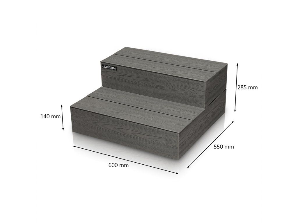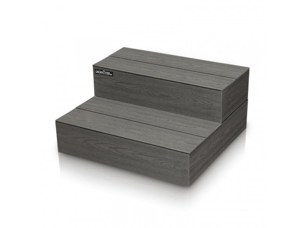 Materiál Lacan je vyroben z vysoce odolného materiálu PWC, který je určen do venkovního prostředí a je zcela rezistentní proti plísním a klimatickým podmínkám. Součástí každého schodiště je vyndavací prvek, pod kterým je umístěn úložný prostor například pro chemii, či příslušenství ke SPA.