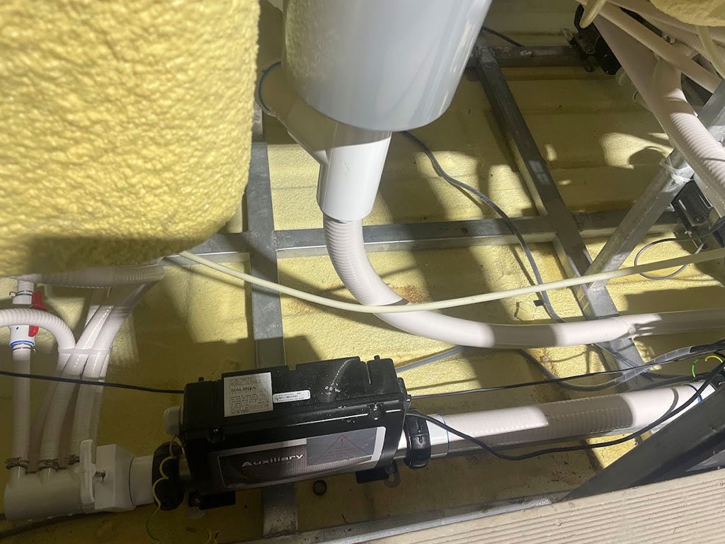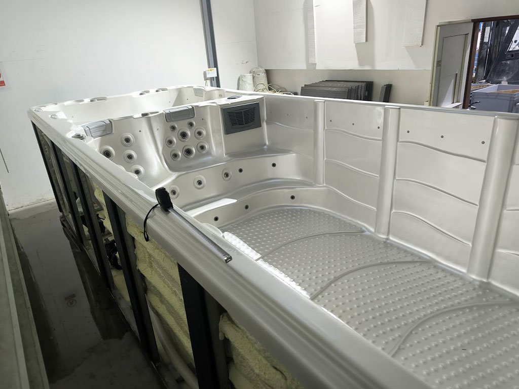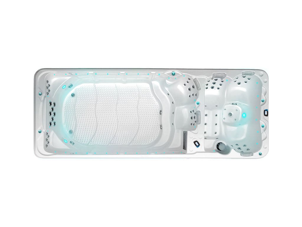 Kompaktnější dvouzónové Swim Spa se samostatnou plaveckou a vířivou částí. 2× dotykový panel Balboa SpaTouch2, 2× řídicí jednotka SPS21X1, 4 hydromasážní čerpadla ve swim zóně a 1 čerpadlo 2.2 kW ve vířivé části, cirkulace 0.37 kW + 0.75 kW, blower 700 W a UV+dezinfekční systém CANZONE 2025 v obou zónách. Skelet Perla, opláštění 02 Old Wood.