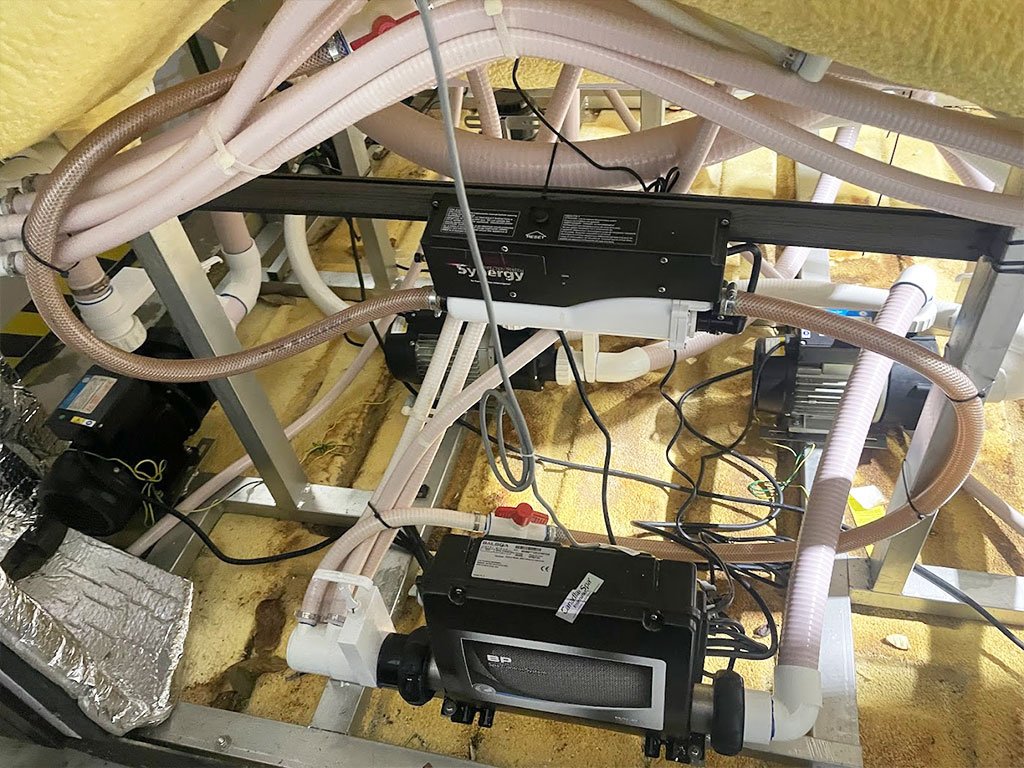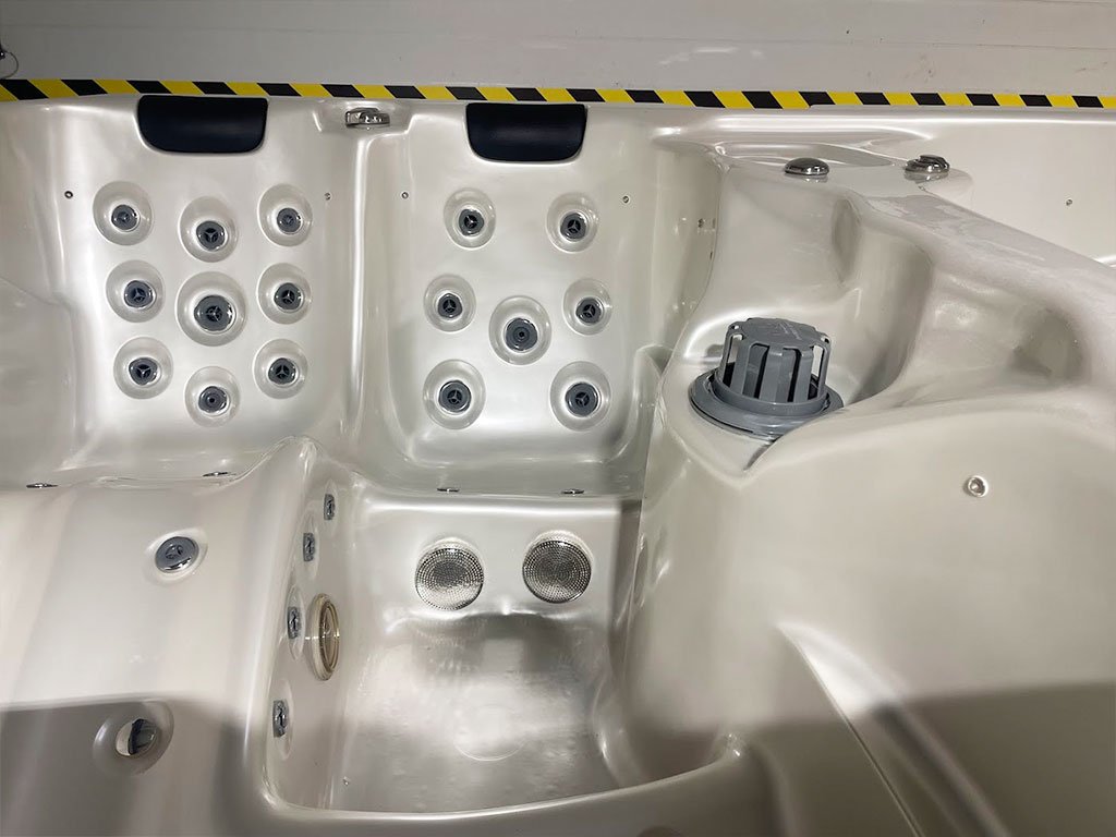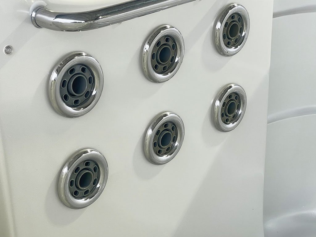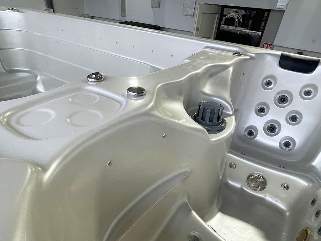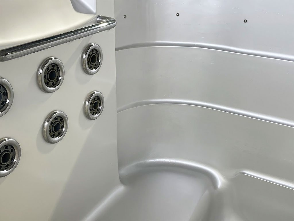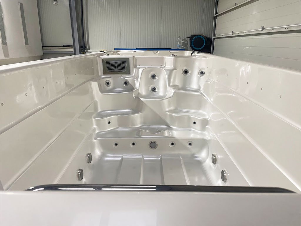 Velkorysé dvouzónové Swim Spa se samostatnou zónou pro plavání a pro relax. Dva dotykové panely SpaTouch2, samostatné řídicí jednotky Balboa SPS21X1 a BP21P4BC pro zónu swim, ohřev 3 kW + pomocný 3 kW, 4 hydromasážní čerpadla ve vířivé části, cirkulace 0.2 kW a cirkulace swim 0.75 kW, blower 700 W, dezinfekční systém CANZONE 2025 v obou zónách. Akryl Perla, opláštění S02 Old Wood.